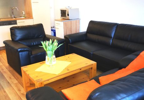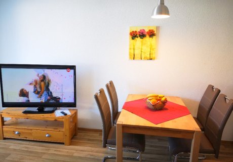 Ferienwohnungen mit einem bis 3 Schlafzimmern, einem bis 3 Badezimmern, gemütliches Wohn-/Esszimmer mit Couchecke, TV, kompletter Küchenzeile mit Geschirrspülmaschine, Herd mit Backofen, Spüle, reichlich Geschirr.