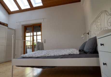 Im ersten Stock befindet sich das helle Schlafzimmer mit offenem Dachstuhl, das Bad mit Dusche und Sitzbadewanne sowie ein schöner, nach Süden und Osten ausgerichteter umlaufender Balkon. Von hier haben Sie einen schönen Ausblick in das alte Fischerviertel und auf eines der dörflichen Storchennester.