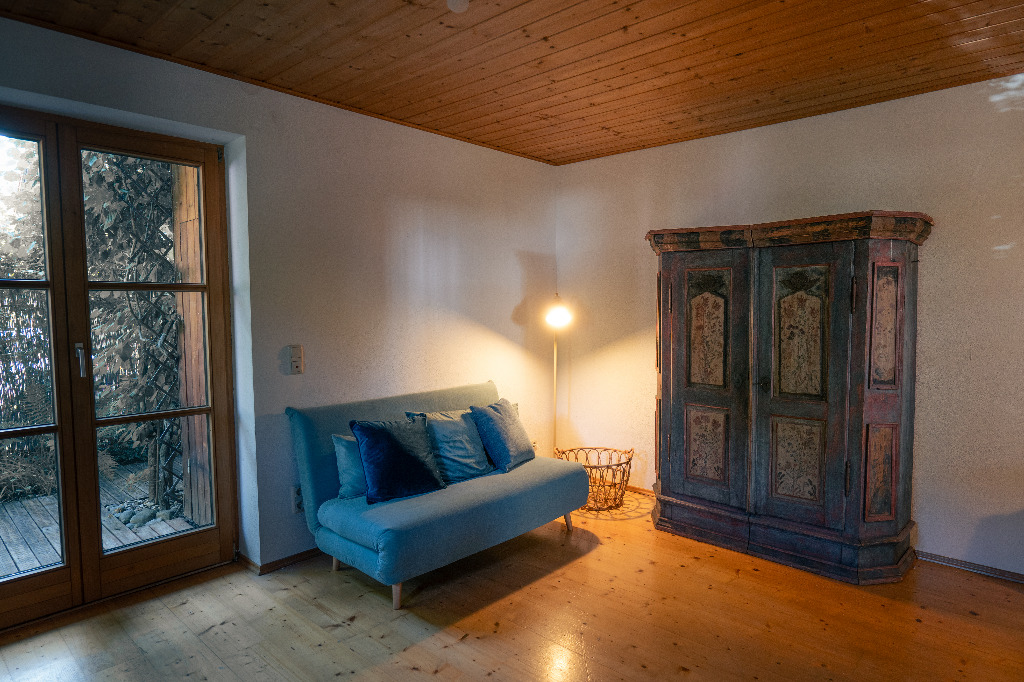 Im Erdgeschoß befindet sich das gemütliche Wohnzimmer mit einem altem Holzofen, einem alten Bauernschrank und einem Schlafsofa sowie eine kleine Küche und das Gäste-WC.