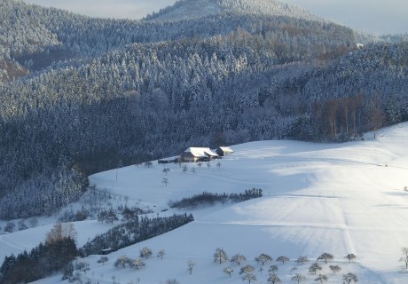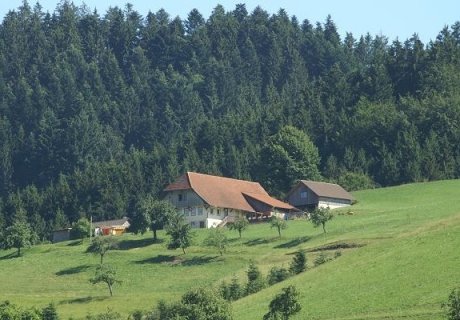Unser Haus liegt ca. 2 km außerhalb des Ortskerns alleine auf einer Anhöhe (ca. 450 müM) inmitten von Wiesen und Wäldern - Straßenlärm suchen Sie hier vergeblich.