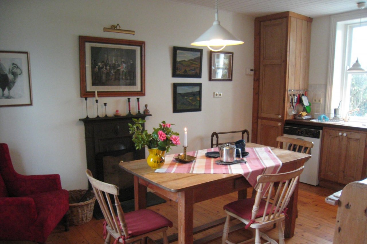 Gemütliche Essküche mit offenem Kamin, Holzfußboden, Einbauschränke aus altem Kiefernholz, moderne Geräte - Keramikkochfeld, Elektroherd, Kühlschrank mit Gefrierfach, Waschmaschine; alter Dresser in Kiefer, Esstisch und 4 Stühle in Kiefer, gemütlicher Ohrensessel neben dem Kamin.
