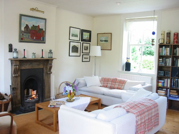 Parterre - Wohnstube mit offenem Kamin, gemuetlich eingerichtet. Die vielen schönen Originalgemälde und hübsche Möblierung verleihem dem Raum eine äußerst behagliche Atmosphäre. Sisalteppich auf Holzfußboden.