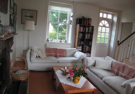 Parterre - Wohnstube mit offenem Kamin, gemuetlich eingerichtet. Die vielen schönen Originalgemälde und hübsche Möblierung verleihem dem Raum eine äußerst behagliche Atmosphäre. Sisalteppich auf Holzfußboden.